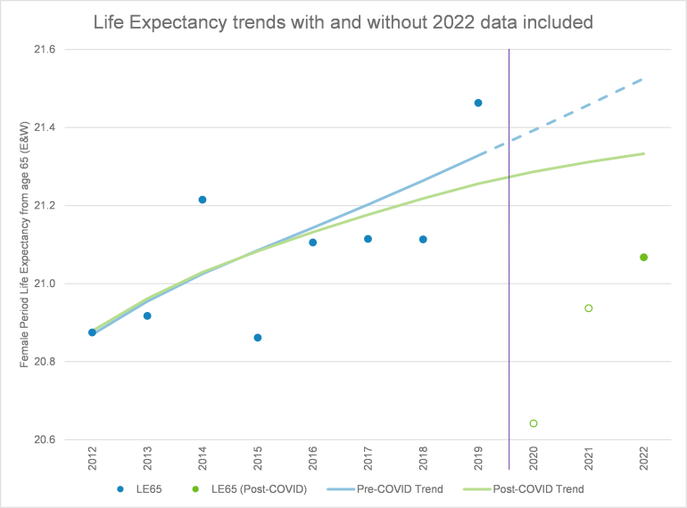 - Allowing for post-COVID data in our longevity projections can materially impact our estimates of smoothed pre-COVID longevity trends.