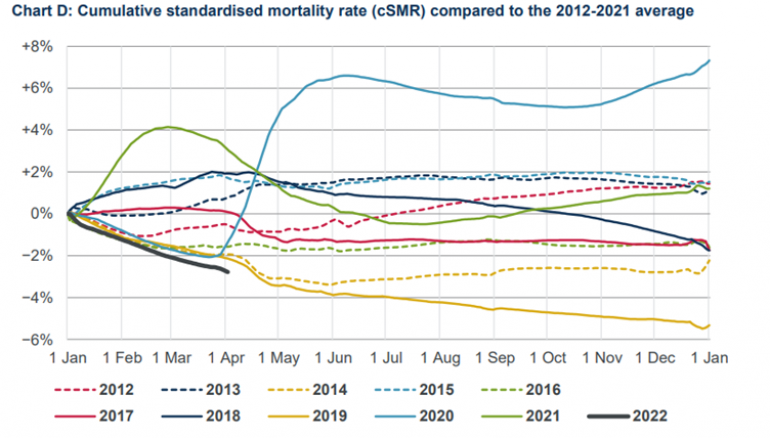 The cumulative 2022 figures – relative to the average over the last decade - are shown by the black line in the chart. According to the CMI, the start to 2022 is the “record best”. This bodes well for a strong rebound in period life expectancy in 2022.