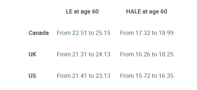 The WHO’s Global Health Estimates show the progression of both life expectancy (LE) and HALE at age 60 between 2000 and 2019 for Canada, UK and US combined for women and men.