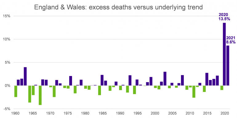 - The UK saw a significant drop in the number of excess deaths in 2021 compared to 2020. In contrast, the US and Canada saw an increase