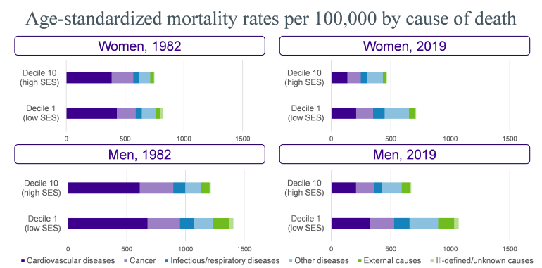 There certainly are some differences in the leading causes of death by socio-economic status (SES), and the contributions of different causes to mortality improvements over time has also varied by socio-economic group.