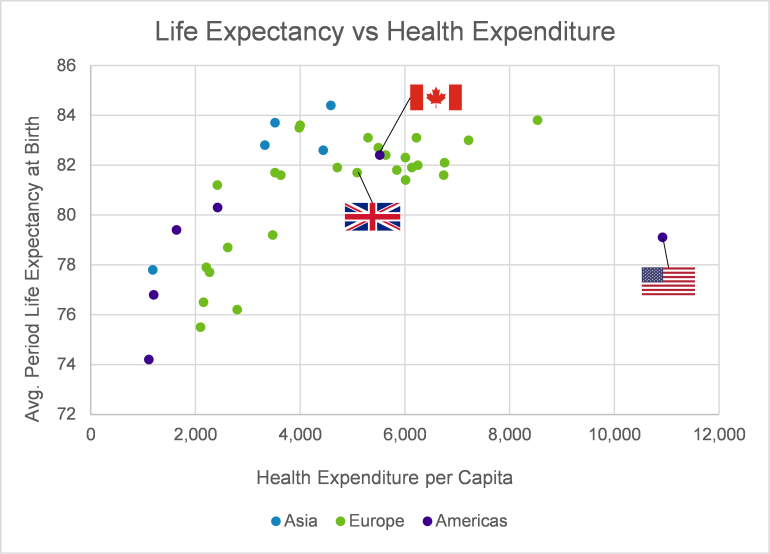 - The US is a distinct outlier when looking at health expenditure by capita compared to average period life expectancy in the country.
