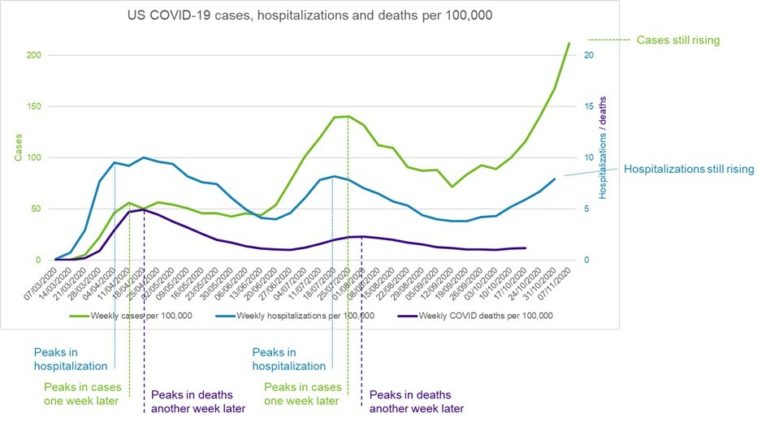 - In general, we see a peak in hospitalizations, followed one week later by a peak in cases and then a further week later by a peak in deaths.