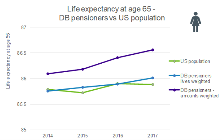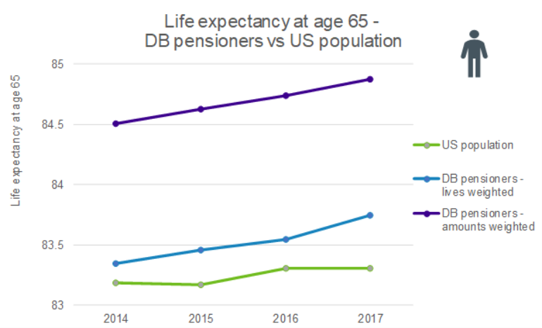 - The blue lines are above the green lines, highlighting the select effect of corporate DB pension plan membership: on average DB pension plan participants have longer life expectancies than the general population.