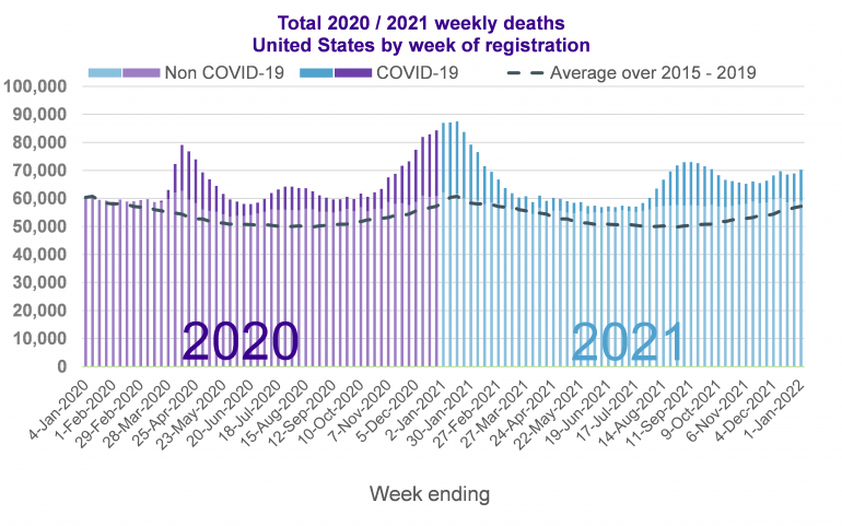 The next chart shows the number of deaths registered in the US each week in 2020 and 2021. The dark bars show deaths recorded as COVID related, the light bars show other deaths. The dotted line shows the average number of deaths for each week of the year based on the previous five years.